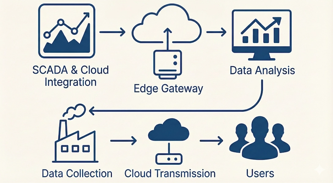 SCADA systems serve as a critical bridge in modern energy management by processing raw data coming from field sensors via edge devices. For example, parameters such as temperature, voltage, and current in transformer centers, pressure in hydroelectric power plants, or vibration in wind turbines are first pre-processed and filtered on edge devices, and then only meaningful and necessary data is sent to the cloud. This smart approach both dramatically reduces network load and ensures instant decisions are made quickly, thereby increasing operational agility.